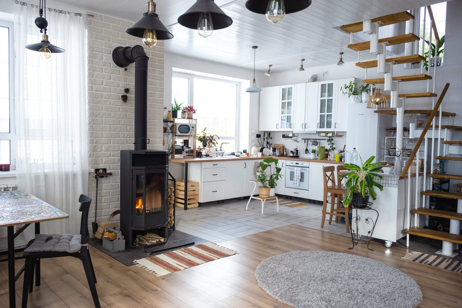 Modern luxury open plan apartment with stairs, communal table, kitchen